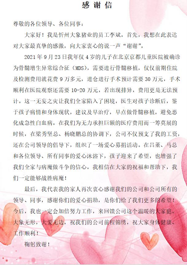 让爱心汇成海洋,让真情放飞希望。山西锦绣大象农牧股份有限公司始终坚持以人为本,实施“人性化”管理,关心员工生活,注重开云(Kaiyun.com)官方网站建设,努力让员工通过奋斗过上幸福安稳的日子。病魔无情,人间有爱。公司作为实现梦想的事业平台,是每位员工的大家庭,让我们凝心聚力、团结奋进,共同将企业做大做强。