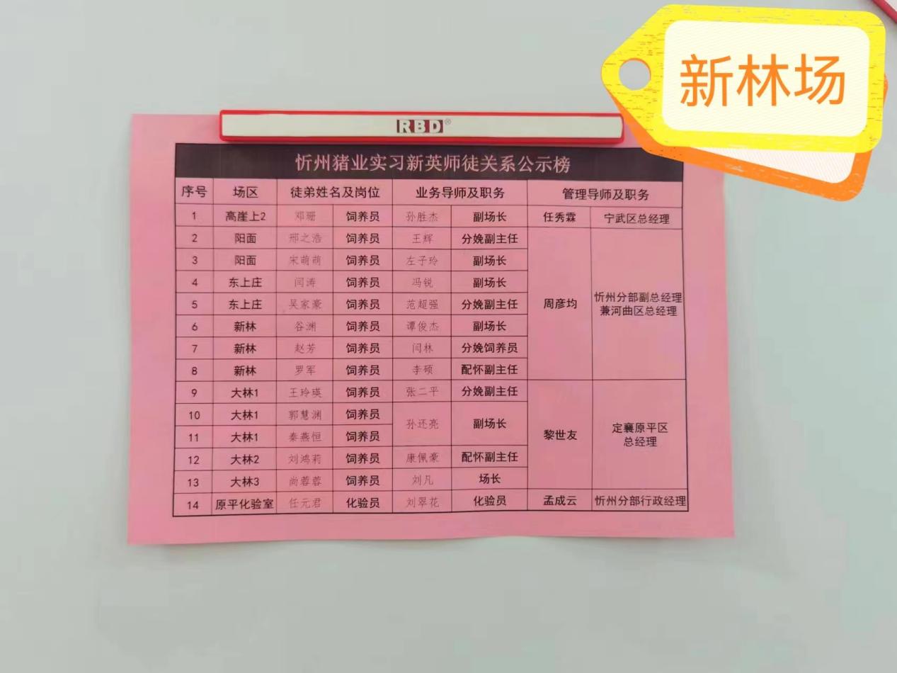 大象猪业忻州分部在接收到实习学生后,第一时间组织管理人员制定针对性培养计划,分别在他们入职的不同时间段制定了相应培养方案。方案具体由场长及副场长或经验丰富的生产人员担任业务导师,进行“一对一”、“手把手”培养,各区域经理为管理导师进行学习方面的督导和管理。要求各生产场在实习生入场之际,在员工餐厅、场区门口等醒目位置张贴“师徒关系榜”进行公示,为这些新进场的实习生“新英”营造一个别开生面的入职“拜师”仪式感氛围。