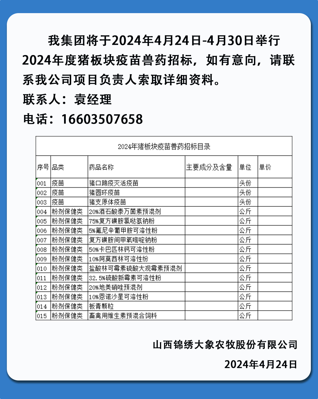 山西锦绣大象农牧股份有限公司2024年猪板块兽药第一次招标